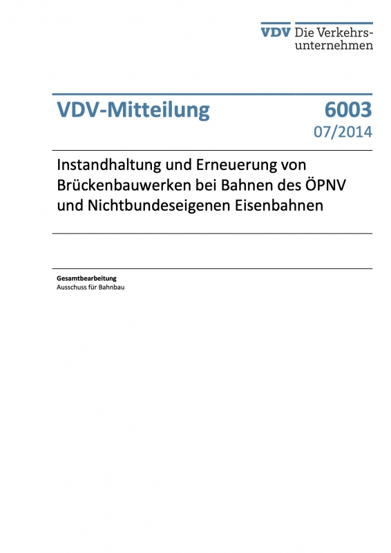 Die von einem Unterausschuss des Ausschusses für Bahnbau erstellte VDV-Mitteilung 6003 soll die Not-wendigkeit und die Wichtigkeit der laufenden Instandhaltung der Brückenbauwerke als Bestandteile des Schienen-Fahrwegs für ihre Substanzerhaltung und ihre sichere Benutzbarkeit deutlich machen. Der Fahrweg aller Arten von Schienenbahnen enthält i. d. R. auch Brücken. Diese unterliegen wie alle Bauwerke nach ihrer Fertigstellung unvermeidlich einem fortwährenden Alterungs- und Verschleiß-Prozess. Damit ihre Verfügbarkeit und sichere Benutzbarkeit trotzdem über lange Zeit erhalten bleiben, müssen sie regelmäßig instand gehalten und bei Bedarf instand gesetzt werden. Nach Ablauf ihrer wirtschaftlichen Nutzungsdauer, die bei sorgfältiger Instandhaltung mehrere Jahrzehnte erreichen kann, steht eine Erneuerung an.