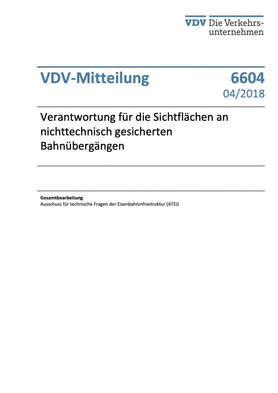 Die VDV-Mitteilung 6604 befasst sich mit der Zuteilung der Verantwortung und den Zuständigkeiten an nichttechnisch gesicherten Bahnübergängen. Bahnübergänge sind höhengleiche Kreuzungen der Verkehrsträger Schiene und Straße. Aufgrund der höhengleichen Kreuzung dieser zwei sehr unterschiedlichen Verkehrsträger sind Bahnübergänge Punkte der Infrastruktur mit erhöhtem Risikopotenzial. Dies gilt insbesondere für nichttechnisch gesicherte Bahnübergänge, bei denen die Übersicht auf die Bahnstrecke die wesentliche Grundlage der Sicherung darstellt. Der Straßenverkehrsteilnehmer und Wegebenutzer muss sich selbst von der gefahrlosen Überquerbarkeit des Bahnübergangs überzeugen.