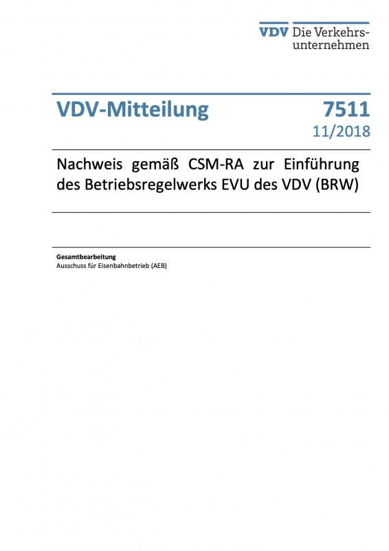 VDV-Mitteilung 7511 Nachweis gemäß CSM-RA zur Einführung des Betriebswerks EVU des VDV (BRW) [eBook im pdf-Format]