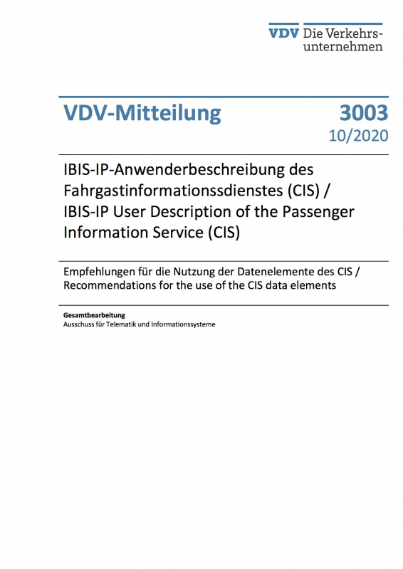 VDV-Mitteilung 3003 IBIS-IP-Anwenderbeschreibung des Fahrgastinformationssdienstes (CIS) – Empfehlungen für die Nutzung der Datenelemente des CIS /