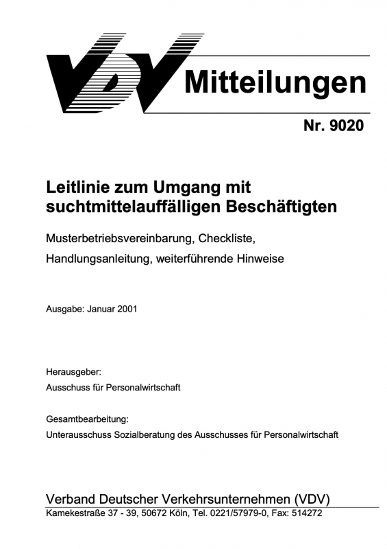 VDV-Mitteilung 9020 Leitlinie zum Umgang mit suchtmittelauffälligen Beschäftigten - Musterbetriebsvereinbarung, Checkliste, Handlungsanleitung, weiterführende Hinweise [eBook im pdf-Format]