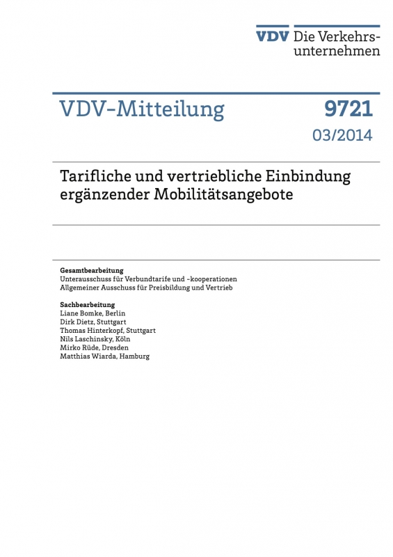 Die Mitteilung 9721 geht der Fragestellungen zur tariflichen und vertrieblichen Einbindung nach, mit dem Ziel, sinnvolle Handlungsoptionen für die ÖPNV-Akteure im Umgang mit den Anbietern der alternativen, individuellen Verkehrsangebote aufzuzeigen. Sie stellt einen weiteren Baustein der VDV-Veröffentlichungen zum Thema Multimodalität dar.