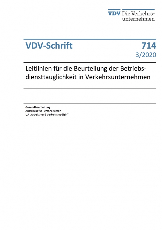 Die VDV-Schrift 714 dient zur Beurteilung der Tauglichkeit (Erst- und Wiederholungsuntersuchung) von Mitarbeitern, die in Verkehrsunternehmen nach BOKraft, BOStrab oder EBO eingestellt werden sollen oder beschäftigt sind.