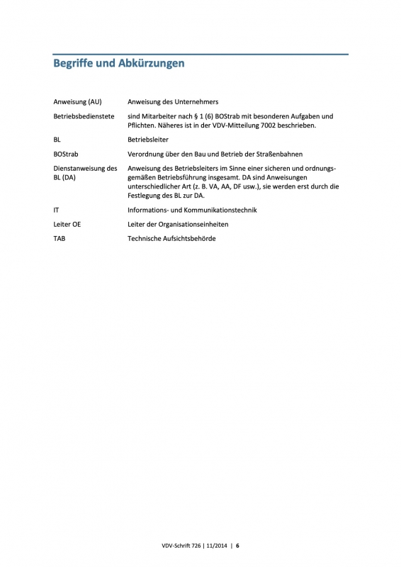 Dem Unternehmer eines Straßenbahnbetriebes wird gemäß PBefG und BOStrab eine besondere Verantwortung zugewiesen. Der Unternehmer ist für die Zuverlässigkeit, Sicherheit und Ordnungsmäßigkeit des BOStrab- Betriebes insgesamt verantwortlich. Der Unternehmer erlässt zur Umsetzung dieser Verantwortung sinnvollerweise eine Unternehmens-Anweisung. Die VDV-Schrift 726 stellt die Verantwortlichkeiten des Unternehmers, die Erläuterung der Funktion des Betriebsleiters BOStrab und die Erläuterung der gemeinsamen Verantwortung von Unternehmer und Betriebsleiter bei der Betriebsdurchführung dar. Sie gibt als Empfehlung einen Handlungsrahmen für eine Unternehmensanweisung vor, ohne den Anspruch zu haben, detaillierte Regelungen festzulegen, wie Unternehmeraufgaben wahrgenommen werden sollen Diese Schrift wendet sich nicht nur an technische und betriebliche Unternehmensleiter (bei denen das Wissen um die Regelungsinhalte von PBefG und BOStrab vorausgesetzt werden kann), sondern ebenso an die Vorstände und Geschäftsführer aus nichttechnischen Organisationseinheiten. Damit hat diese Schrift nicht zuletzt auch informierende Funktion, Verweise oder Zitate aus PBefG und BOStrab werden dort gebracht, wo sie zur Verdeutlichung nötig erscheinen. Die Rahmenanweisung des Unternehmers nach BOStrab sowie die Rahmendienstanweisung des Betriebsleiters BOStrab (VDV-Schrift 721) sind im Zusammenhang zu sehen und bilden das organisatorische Fundament zur sicheren und ordnungsgemäßen Betriebsdurchführung.