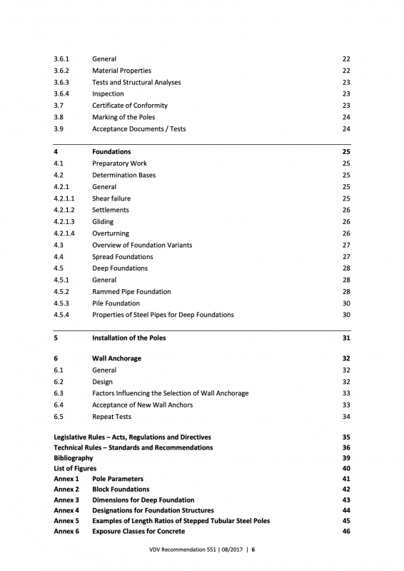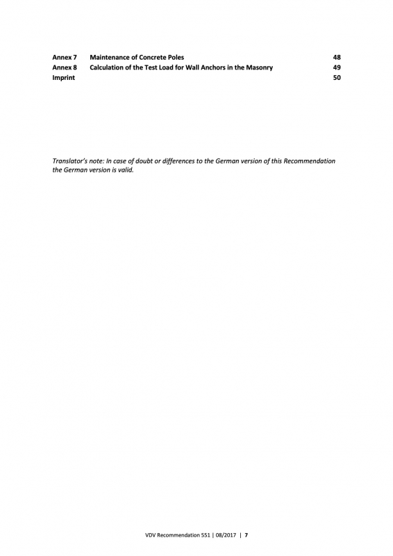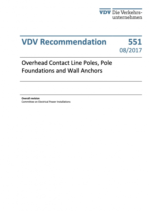 VDV Recommendation 551 specifies overhead contact line poles and wall anchors for urban DC rail systems operated pursuant to the German Federal Regulations on the Construction and Operation of Tramways (BOStrab), the German Federal Regulations on the Construction and Operation of Railways (EBO) and the German Federal Regulations on the Construction and Operation of Narrow-Gauge Railways (ESBO), i.e. for tramway and light rail systems as well as trolleybus systems. Moreover, it comprises an overview of the pole foundation variants. It is the objective of this Recommendation to provide the employees responsible for overhead contact lines (OCLs) in public transport companies, engineering firms, the supply industry and building enterprises with advice on the design, dimensioning and selection of poles and their foundations. The Recommendation goes into detail with the actions, load cases and load combinations that the poles have to withstand and that have to be specified by the operators of OCLs. Moreover, it gives an overview of the foundation variants inclusive of their advantages and disadvantages as well as of the requirements for wall anchors, which are an interesting alternative to the classic pole foundation. The 08/2017 edition of VDV Recommendation 551 is the result of a revision of the 12/2014 edition