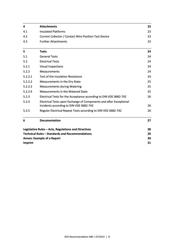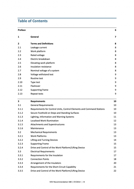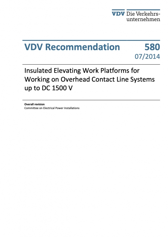 VDV Recommendation 580 covers the electrical requirements for the design and operation of elevating work platforms fitted on vehicles. It describes the special requirements for elevating work platforms for working on urban rail system on the basis of the standard DIN VDE 0682-742. This Recommendation applies to elevating work platforms with standing surface insulation intended for working on and near live parts of overhead contact line systems up to a nominal voltage of AC 1000 V and DC 1500 V – also in the rain. The mechanical tests are to be carried out in accordance with EN 280 and are not included in the scope of this VDV Recommendation. VDV Recommendation 580 supersedes VDV Report 5005 with the same title.