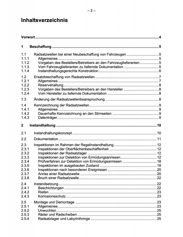 Empfehlung zur Beschaffung und Instandhaltung von Radsatzwellen von Stadtbahn- und U-Bahnfahrzeugen Ausgabe 07/11 Die VDV-Schrift 173 soll die Verkehrsunternehmen bei der Beschaffung, Inspektion, Instandsetzung sowie Montage und Demontage von Radsatzwellen der Nahver-kehrsschienenfahrzeuge unterstützen. Sie basiert auf den gesammelten Betriebs-erfahrungen sowie auf den gängigen Instandhaltungsverfahren von VDV-Mitgliedsun-ternehmen mit Bahnen gemäß BOStrab und berücksichtigt den Stand der Technik. Gegenüber ihrer Vorgängerin aus dem Jahre 2002, der VDV-Mitteilung 1503, die durch die VDV-Schrift 173 ersetzt wird, wurde in die Schrift insbesondere ein Inspek-tionskonzept für die Detektion von Ermüdungsanrissen neu aufgenommen. Es wer-den hierbei nur die grundsätzlichen Überlegungen für die Erstellung des Konzeptes vorgegeben, da die Fristenfestlegung für jedes Verkehrsunternehmen individuell zu ermitteln ist. Ggf. ist dazu externer Sachverstand notwendig. Diese VDV-Schrift gilt für Treib- und Laufradsätze von Stadtbahn- und U-Bahn-Fahr-zeugen. Sie kann auch für Radsatzwellen anderer Schienenfahrzeuge angewandt werden, wenn ähnliche oder vergleichbare Einsatzbedingungen wie bei Bahnen gemäß BOStrab vorliegen.