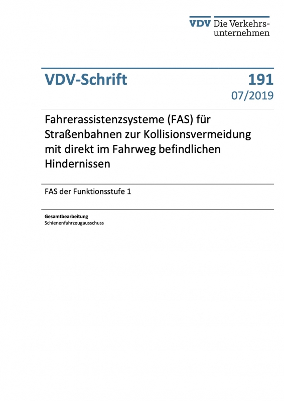 VDV-Schrift 191 Fahrerassistenzsysteme (FAS) für Straßenbahnen zur Kollisionsvermeidung mit direkt im Fahrzeug befindlichen Hindernissen