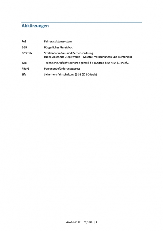 Fahrerassistenzsysteme unterschiedlichster Ausprägung sind mittlerweile für Kraftfahrzeuge aller Art verfüg¬bar. Seit einigen Jahren untersuchen mehrere VDV-Mitgliedsunternehmen deren Einsatz auch in Straßen- und Stadtbahn-Fahrzeugen, insbesondere zur Kollisionsvermeidung mit direkt im Fahrweg befindlichen Hindernis¬sen. Da inzwischen ausreichende Erfahrungen mit dem Testbetrieb solcher Systeme vorliegen, wurde diese VDV-Schrift erstellt, um allen VDV-Mitgliedsunternehmen eine Hilfestellung bei der Einführung von Fahrerassistenzsystemen (FAS) zu geben. Insbesondere soll diese VDV-Schrift die Verkehrsunternehmen mit Straßen- und Stadtbahnbetrieb (straßenabhängige Bahnen gemäß § 2 BOStrab (§ 4 (1) PBefG)) unterstützen, bei der Beschaffung von Neufahrzeugen oder beim Nachrüsten von Bestandsfahrzeugen die technischen Spezifikationen, die Verfahren für die Zulassung (Inbetriebnahme gemäß § 62 BOStrab) und Regelungen hinsichtlich der vertraglichen Abnahme von FAS gemäß BGB zu erstellen. Darüber hinaus werden auch Empfehlungen zur Einführung und zum Betrieb dieser Systeme gegeben. Unter FAS werden in dieser VDV-Schrift die Systeme verstanden, die zur Kollisionsvermeidung mit direkt im Fahrweg befindlichen Hindernissen verwendet werden