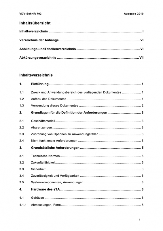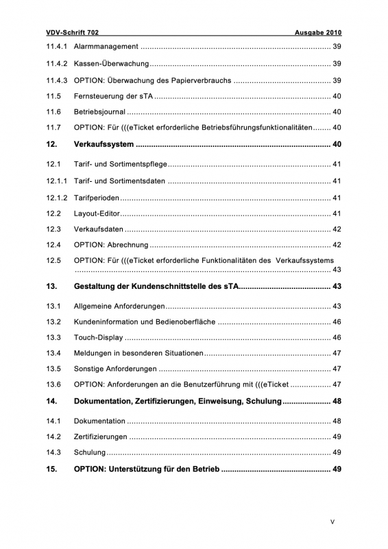 Die vorliegende VDV-Schrift ersetzt die Schrift „Lastenheft für stationäre Ticket-automaten“ aus dem Jahre 1991 und stellt den aktuellen Stand der Technik dar. Als eine entscheidende technische Neuerung gegenüber der vorangegangenen VDV-Schrift 702 empfiehlt die Arbeitsgruppe ausschliesslich die Verwendung der Touch-Display-Technik für die Kundenschnittstelle. Der Hauptteil dieses Dokumentes entspricht in seiner Gliederung einem möglichen Lastenheft, wie es für die Beschaffung eines stationären Ticketautomaten gestaltet sein könnte. Insofern soll sie auch textlich Hilfestellung für die Beschaffungsstelle geben und kann abschnittsweise in den technischen Teil eines auftraggeber-spezifischen Lastenheftes integriert werden. Vor dem Verfassen des individuellen Lastenheftes muss jede beschaffende Stelle aber zuerst grundsätzliche Ent-scheidungen treffen. Solche Stellen sind im Dokument mit OPTION gekennzeichnet. HINWEISE liefern Hintergrundinformationen. Zur besseren Verständlichkeit des Ticketautomaten, seiner Funktionalitäten und seiner Einbindung in die Informatik-Systeme des Verkehrsunternehmens, sind in Anhang 1 die wichtigsten Geschäftsprozesse mit den entsprechenden Anwendungs-fällen beschrieben. In Anhang 2 sind Normen und Standards aufgeführt, die ggf. zu beachten sind. Als Hilfestellung für die im konkreten Fall zu treffenden Entscheidungen ist in Anhang 3 ein unverbindlicher Katalog aus Anforderungen an behindertengerechte Ticketautomaten zusammengestellt. In Anhang 5 wird mittels einer Frontskizze eine Empfehlung über die Anordnung der Informations- und Bedienelemente am Ticketautomaten gegeben. Anhang 6 liefert einige allgemeine Hinweise betreffend Gestaltung einer Ausschreibung und Abwicklung des Beschaffungsverfahrens. Zusätzlich zu den technischen Aspekten machen die Autoren auf die Notwendigkeit von weiteren Bestandteilen aufmerksam, welche aber in diesem Dokument nicht im Detail beschrieben werden.