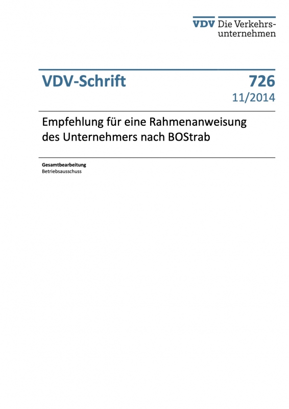 Dem Unternehmer eines Straßenbahnbetriebes wird gemäß PBefG und BOStrab eine besondere Verantwortung zugewiesen. Der Unternehmer ist für die Zuverlässigkeit, Sicherheit und Ordnungsmäßigkeit des BOStrab- Betriebes insgesamt verantwortlich. Der Unternehmer erlässt zur Umsetzung dieser Verantwortung sinnvollerweise eine Unternehmens-Anweisung. Die VDV-Schrift 726 stellt die Verantwortlichkeiten des Unternehmers, die Erläuterung der Funktion des Betriebsleiters BOStrab und die Erläuterung der gemeinsamen Verantwortung von Unternehmer und Betriebsleiter bei der Betriebsdurchführung dar. Sie gibt als Empfehlung einen Handlungsrahmen für eine Unternehmensanweisung vor, ohne den Anspruch zu haben, detaillierte Regelungen festzulegen, wie Unternehmeraufgaben wahrgenommen werden sollen Diese Schrift wendet sich nicht nur an technische und betriebliche Unternehmensleiter (bei denen das Wissen um die Regelungsinhalte von PBefG und BOStrab vorausgesetzt werden kann), sondern ebenso an die Vorstände und Geschäftsführer aus nichttechnischen Organisationseinheiten. Damit hat diese Schrift nicht zuletzt auch informierende Funktion, Verweise oder Zitate aus PBefG und BOStrab werden dort gebracht, wo sie zur Verdeutlichung nötig erscheinen. Die Rahmenanweisung des Unternehmers nach BOStrab sowie die Rahmendienstanweisung des Betriebsleiters BOStrab (VDV-Schrift 721) sind im Zusammenhang zu sehen und bilden das organisatorische Fundament zur sicheren und ordnungsgemäßen Betriebsdurchführung.
