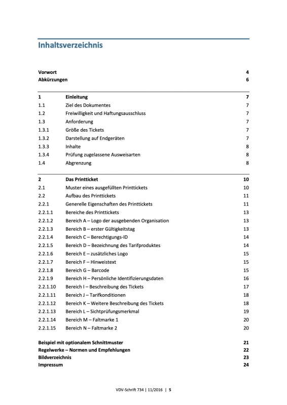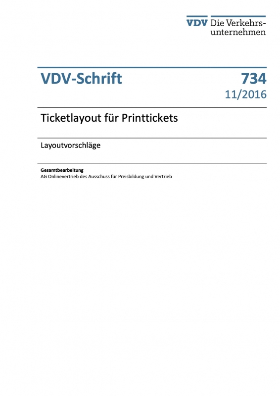 Mit dieser VDV-Schrift wird ein Ticketlayout für Printtickets mit Barcodes beschrieben, das auf ein gleichartiges Erscheinungsbild von Printtickets unabhängig von ausgebender Organisation bzw. deren Systemherstellers hinwirkt. Der Einsatz des Layouts ist insbesondere für Tarifprodukte geeignet, die regionsübergreifende Abstimmungen erfordern, wie z. B. bundesweite Ticketkooperationen.